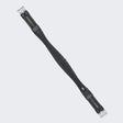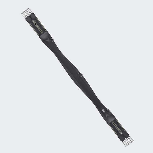 A split-end leather girth with elastic on both sides and with rings.